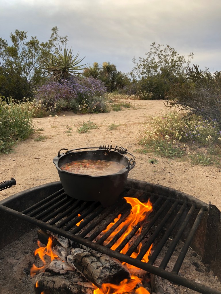 Mary made an incredible stew from The Great Outdoors cookbook – Hearty Lentil Stew with Bacon and Potatoes (and garlic herb chicken sausage). Cooked on an open fire in the new cast iron dutch oven with some uninterrupted beers made for a spectacular dinner. The sunset didn’t hurt either.