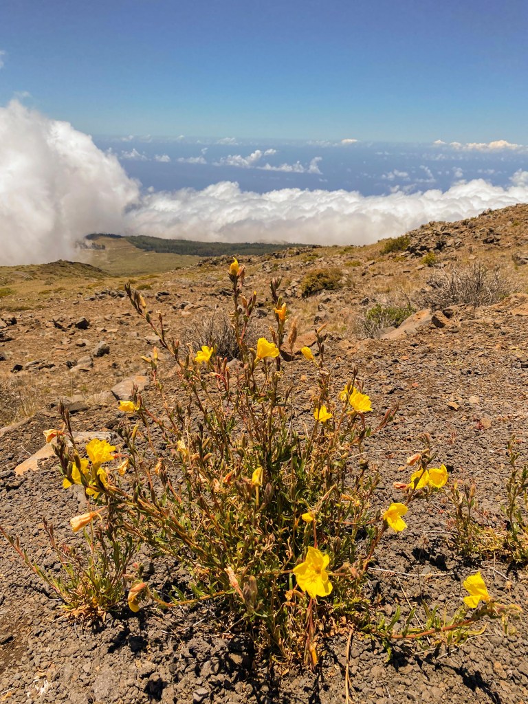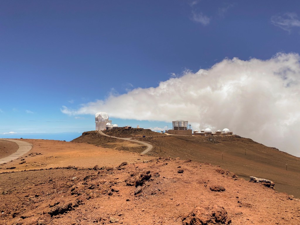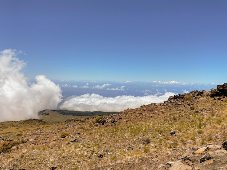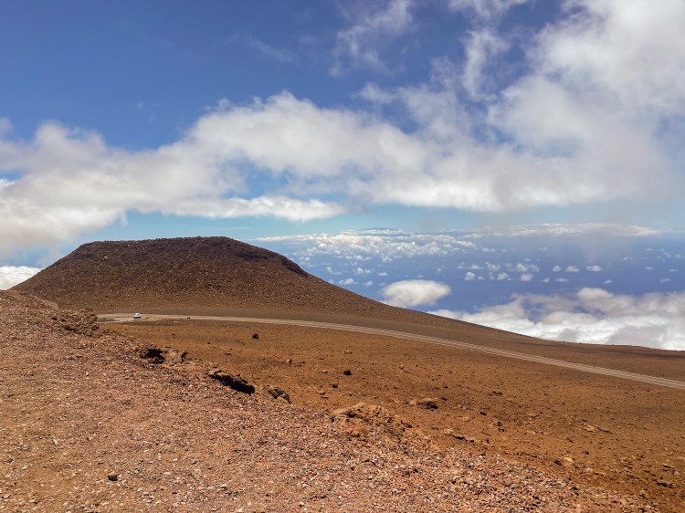 Once at the summit, we parked and explored to take in the views. From 10,000′, we were able to see the Island of Hawaii 80-100 miles away in the distance. We also were able to see the nearer islands and other half of Maui. What was also amazing was that there were cloudbanks moving below us around 8,000′ and we could see down on top of them as they moved across the landscape.