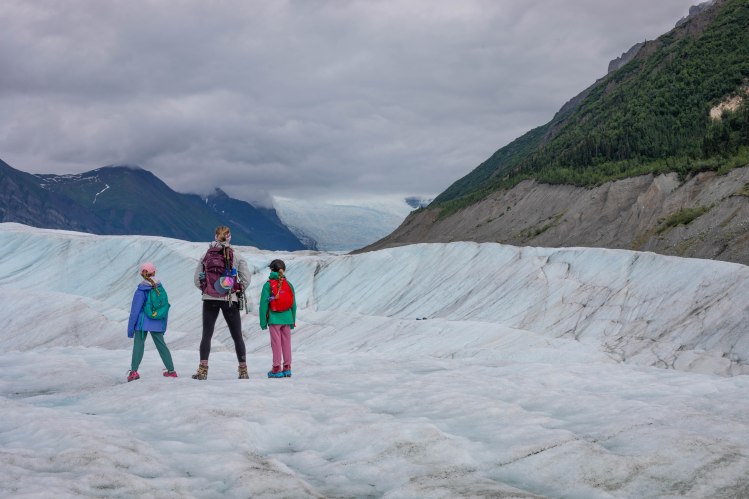 The hike to Root Glacier was easy- about 1.5 miles on a clearly marked trail to the base of the glacier. From there, we put on some microspikes, which are rubber boot covers with metal traction spikes – like snow chains for cars, but for boots. We purchased them on Amazon and they worked great as we walked around the giant river of ice. Again, this is the one trip where we used every item that we packed. Once we got on the glacier, the temperature dropped 10-15 degrees and there were no mosquitos flying around you. We spent about 30-45 minutes walking and seeing the small streams of water carving channels through the ice. After hiking back off the glacier, we stopped in the lodge in Kennecott and rewarded ourselves with beers, sodas and chocolate chip cookies. Once back at the campground, the girls started roaming around the campground putting their imaginations to work. They found a family of kids from Germany that spoke English and they played for a bunch of hours before dinner and bed time.