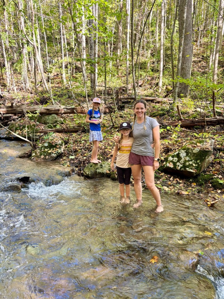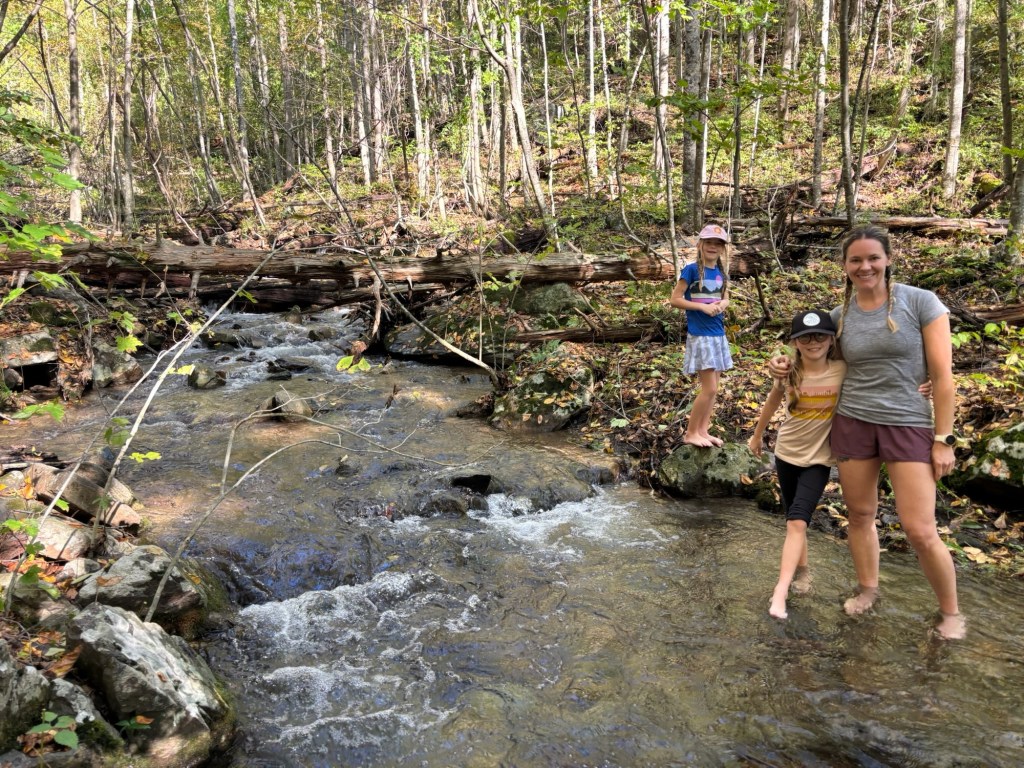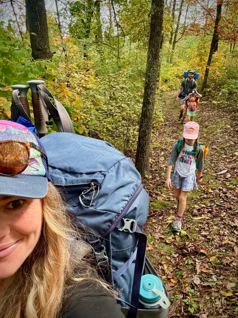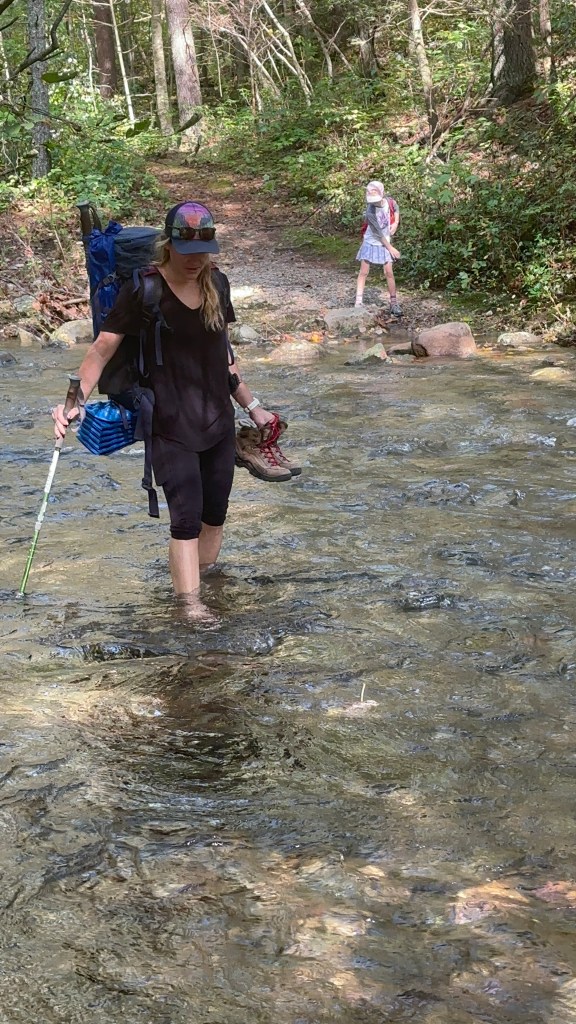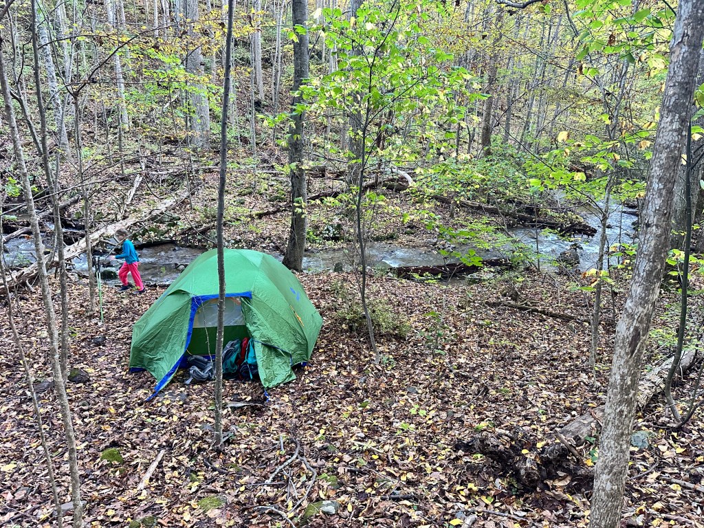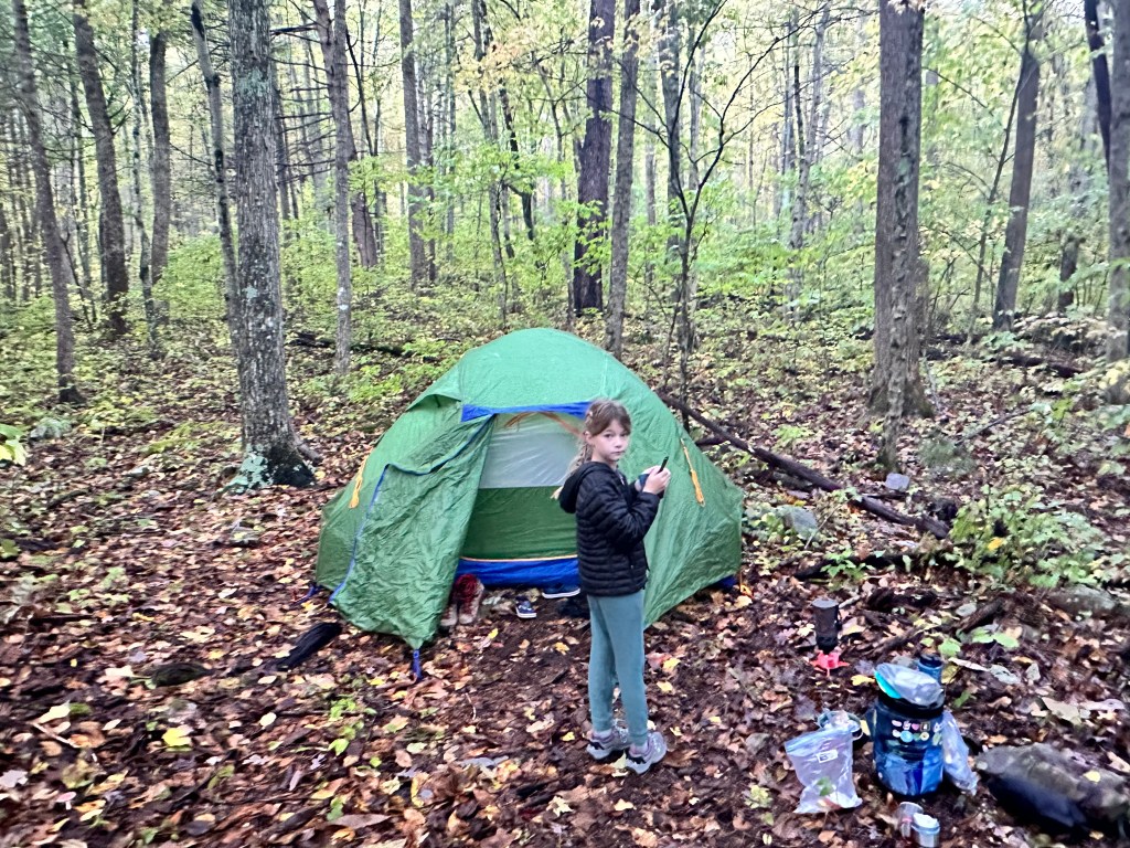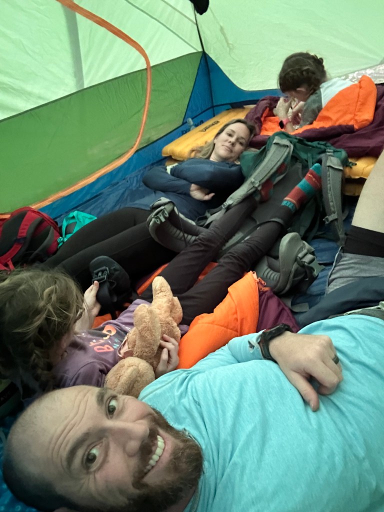 On Day 1, we found parking, checked the weather one last time and loaded up our packs. The weather was overcast and cool, perfect for hiking. We set into our standard hiking order: Mary, Quincy, Leona, Sean. Along the first 5 miles that day, we probably saw about 4 other people. The peacefulness was amazing. We had to crawl through some felled trees due to the storms and bushwhack a bit, but not too much. We also encountered some stream crossings that required Mary and I to take off our boots and shuttle the kids across the streams. Water was usually shin to knee high and made it fun to start the hike. After checking where we were on the All Trails app, we made a plan to finish all of the stream crossings on Day 1, then found a nice campsite just past the last crossing. We set up the tent and relaxed. Then the rain started. It wasn’t supposed to come until later in the evening, but started around 5pm. We ended up making dinner just outside the tent, ate in the tent while it poured and then got settled in for the night.