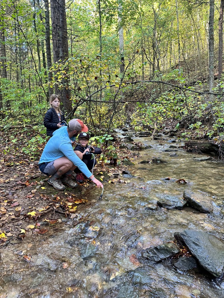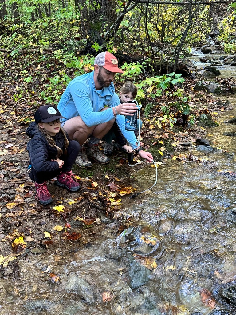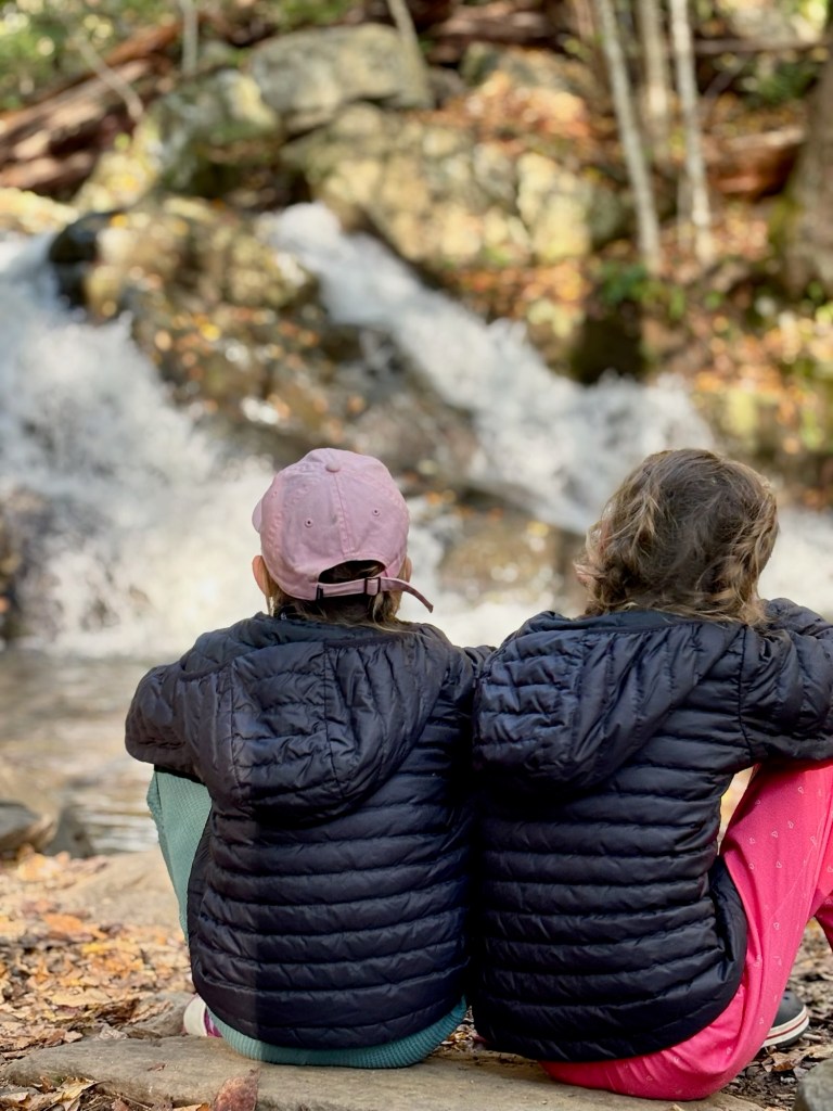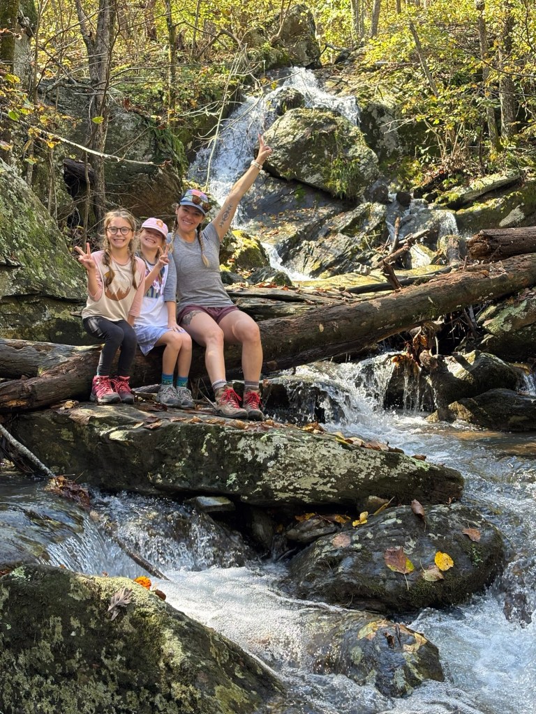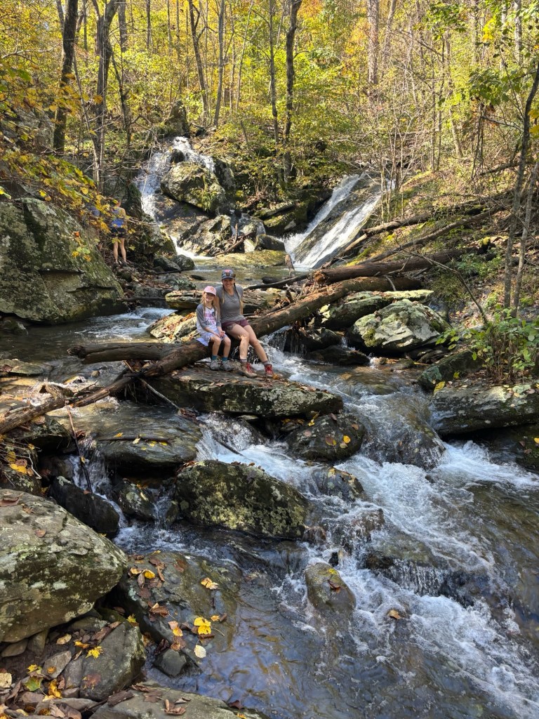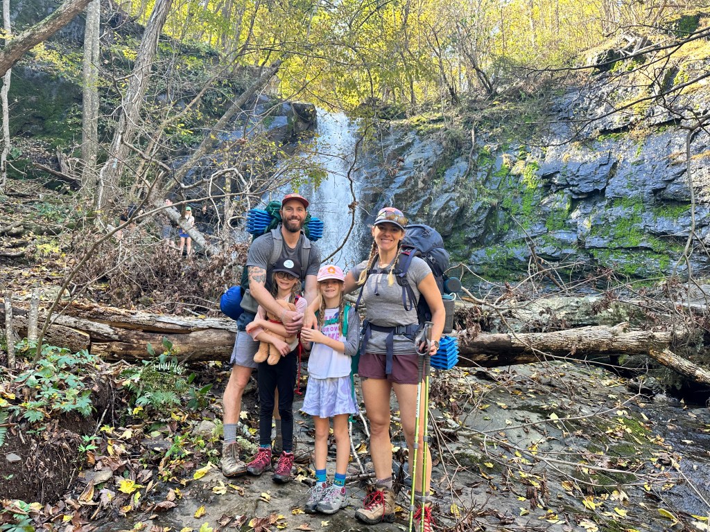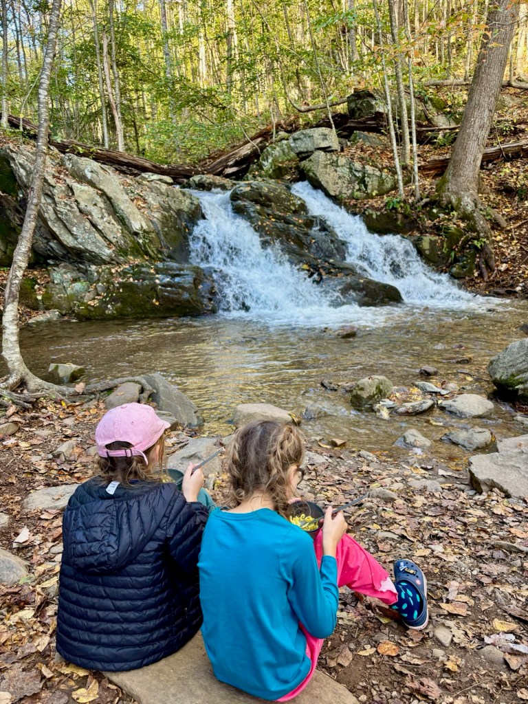 Day 2 started with breakfast (oatmeal, coffee, tea, hot chocolate, and dehydrated eggs) and filtering water in the stream. We packed up quickly and started hiking uphill to get back to Skyline Drive where we would cross the road and start hiking back downhill. We started encountering more hikers on the trail and the respect given to the girls for their effort and work was great. People showing their excitement to see young kids on the trail never gets old and is something that we hope the girls appreciate as well. We had lunch at a small picnic area where we laid out our tent and rainfly to dry it off from the rain. After lunch, we hit a popular stretch of trail and hiked with tons of people and dogs, which were allowed at this park. We hiked past the Jones River Falls, Lower Doyles River Falls, Upper Doyles River Falls, logging around 10-11 miles on day 2. Finding a campsite for the second night was a bit trickier. We were looking for spots off the trail, but the terrain wasn’t the flattest. We found a spot just above the last water fall and set up camp. Dinner that night was a memorable one. We sat near a small pool below a waterfall. We had the whole place to ourselves as the dayhikers had retreated back to their cars and campgrounds for the day. It was a great reminder of the benefits of putting in the hard work to backpack – the special moments like this.